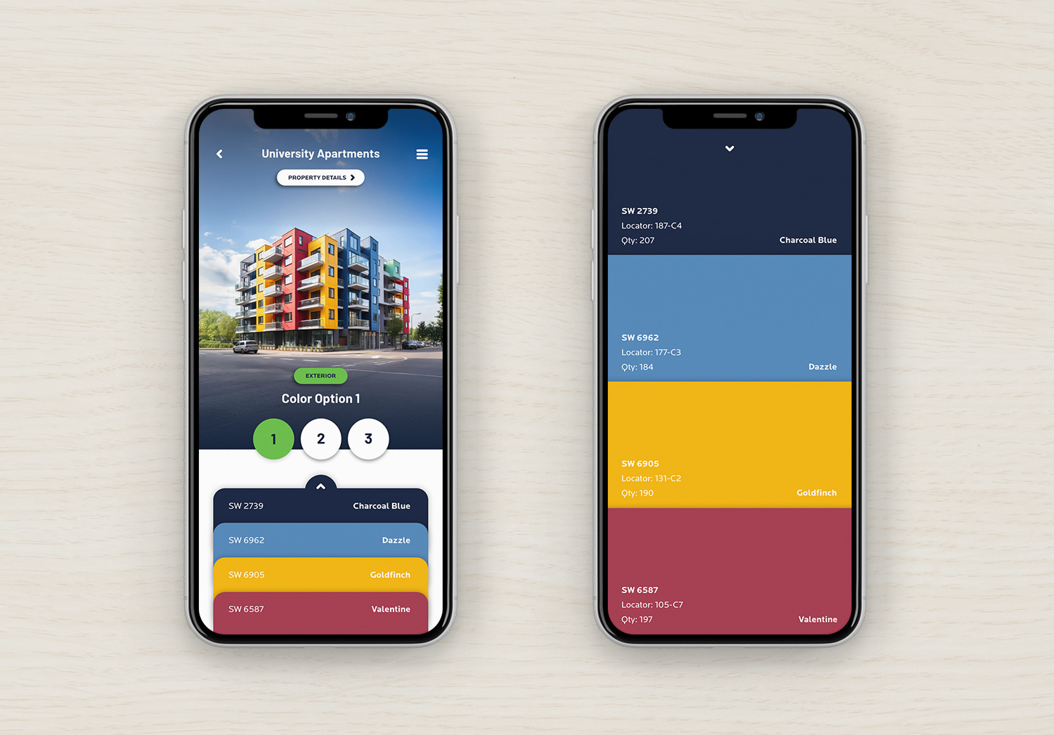 The following app was designed for the Sherwin-Williams B2B sales team. Company associates are able to submit orders to the in-house design service and present professionally curated paint options to their business partners and potential clients.